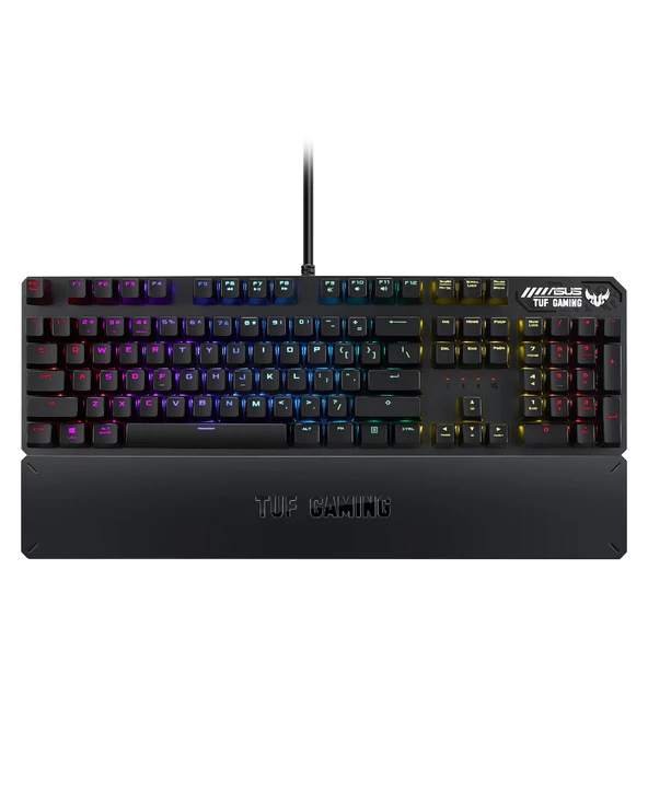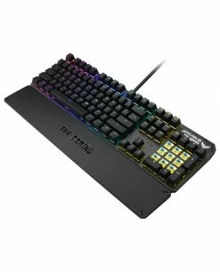 ASUS TUF Gaming K3. Facteur de forme du clavier: Taille réelle (100 %), Interface de l’appareil: USB, Interrupteur à clé de clavier: Clavier mécanique. Type de rétro: LED RGB, Repose-poignets. Utilisation recommandée: Jouer. Couleur du produit: Gris