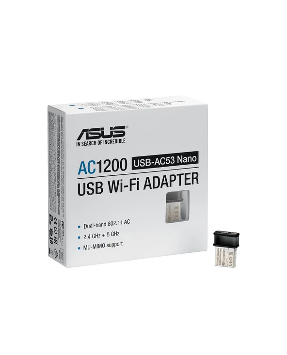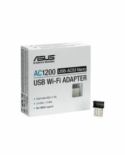 ASUS USB-AC53 Nano. Technologie de connectivité: Sans fil, Interface de l’hôte: USB, Interface: WLAN. Débit de transfert des données maximum: 867 Mbit/s, Norme Wi-Fi: Wi-Fi 5 (802.11ac), Bande Wi-Fi: Bi-bande (2,4 GHz / 5 GHz). Alimenté par port USB. Couleur du produit: Noir, Acier inoxydable