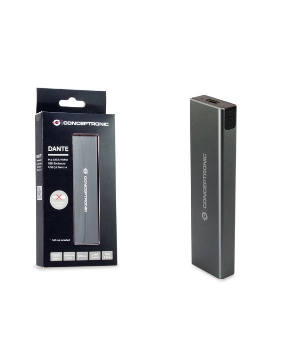 Conceptronic DANTE01G. Type de produit: Enceinte ssd. Nombre d’unités de stockage pris en charge: 1, Taille de l’unité de stockage: M.2, Interfaces de lecteur de stockage prises en charge: M.2. Taux de transfert des données: 10 Gbit/s. Couleur du produit: Gris. Connecteur USB: USB Type-C