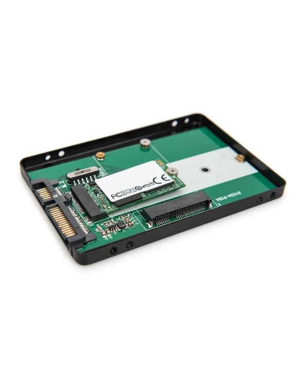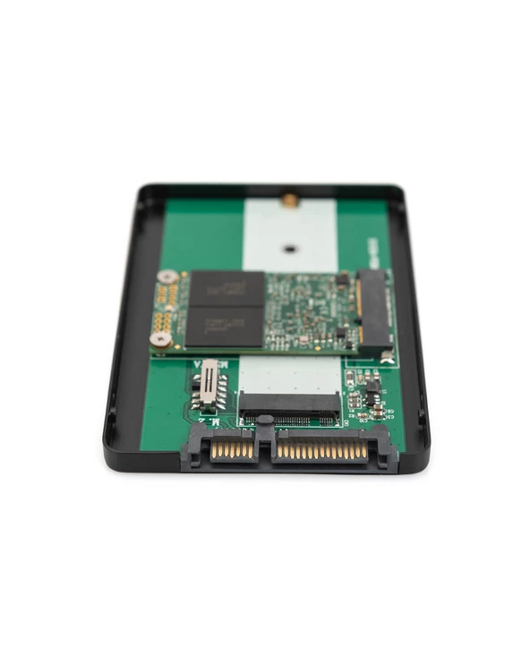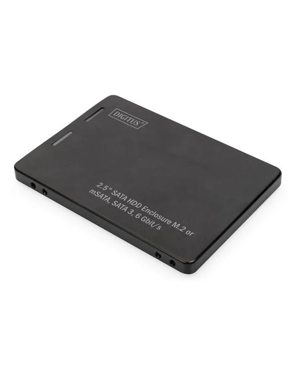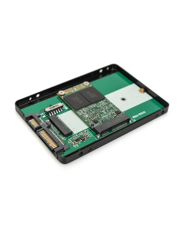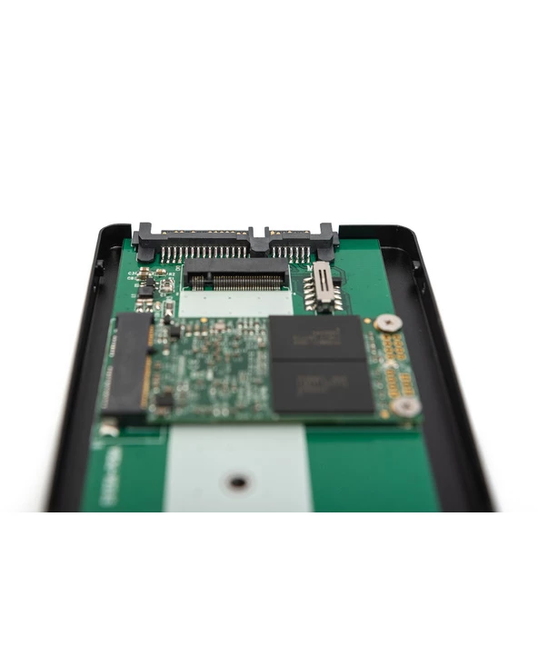 L’adaptateur de disque dur SATA 2,5 po DIGITUS® permet d’accroître la vitesse et les performances du système à moindre coût grâce à l’installation d’un disque dur SSD M.2 ou mSATA sur votre PC ou ordinateur portable. L’adaptateur de disque dur est utilisé comme un disque dur de 2,5 po standard doté d’un connecteur SATA III. Grâce à la faible hauteur de montage de seulement 7 mm, l’installation peut être effectuée sur tous les ordinateurs portables courants. Les disques durs SSD M.2 (NGFF) de type suivant sont pris en charge : M.2 de type 2230, 2242, 2260, 2280 avec clé B et clé B+M. Une prise en charge des disques durs SSD M.2 PCIe NVMe avec clé M n’est pas fournie. En outre, les disques durs SSD mSATA dotés d’un connecteur Mini PCIe 52 broches comme variante de taille normale sont prises en charge. Le disque dur SSD installé respectif est sélectionné par le commutateur DIP sur la platine. Les procédures de démarrage sont prises en charge par l’adaptateur pour tous les systèmes d’exploitation standard comme Windows, Mac OS ou Linux. La mémoire SSD interne est protégée de la poussière et de l’endommagement grâce au boîtier en aluminium entièrement fermé. Grâce à l’interface SATA III, une vitesse de transmission de données de 6 Gb/s est offerte. La vitesse de lecture peut atteindre jusqu’à 520 MB/s indépendamment du disque dur SSD utilisé. L’adaptateur prend en charge SATA Rév.3.2 doté du mode d’économie d’énergie DEVSLP.