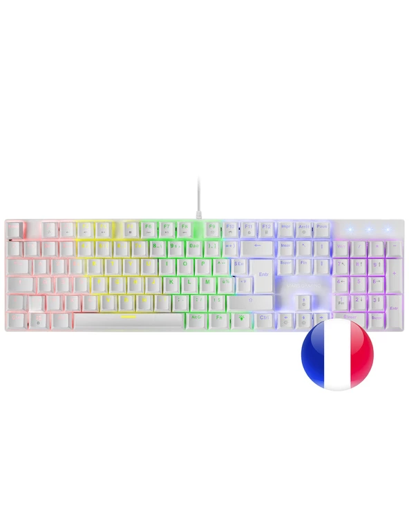 Mars Gaming MK422WRFR. Facteur de forme du clavier: Taille réelle (100 %), Interface de l’appareil: USB, Interrupteur à clé de clavier: Clavier mécanique, Disposition des touches du clavier: AZERTY. Type de rétro: LED RGB. Longueur de câble: 1,5 m. Utilisation recommandée: Jouer. Couleur du produit: Blanc
