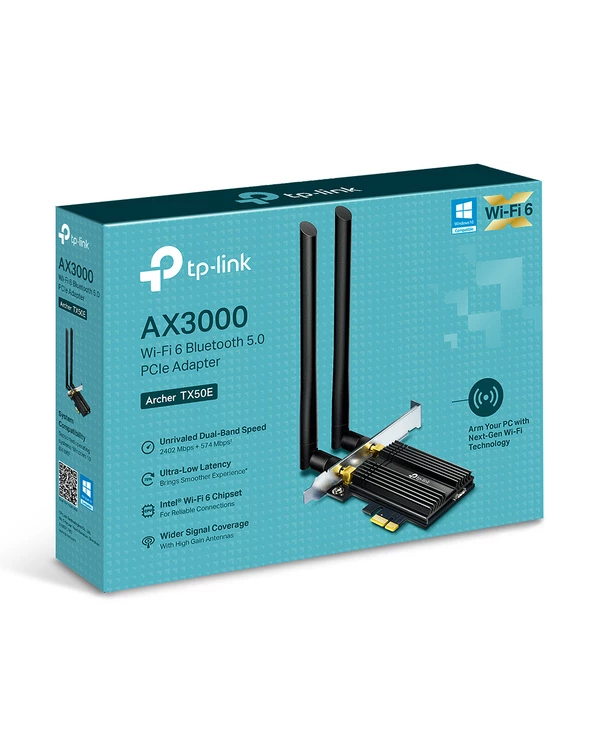 TP-LINK Archer TX50E. Technologie de connectivité: Sans fil, Interface de l’hôte: PCI Express, Interface: WLAN / Bluetooth. Débit de transfert des données maximum: 2402 Mbit/s, Norme Wi-Fi: Wi-Fi 6 (802.11ax), Bande Wi-Fi: Bi-bande (2,4 GHz / 5 GHz). Couleur du produit: Noir, Métallique
